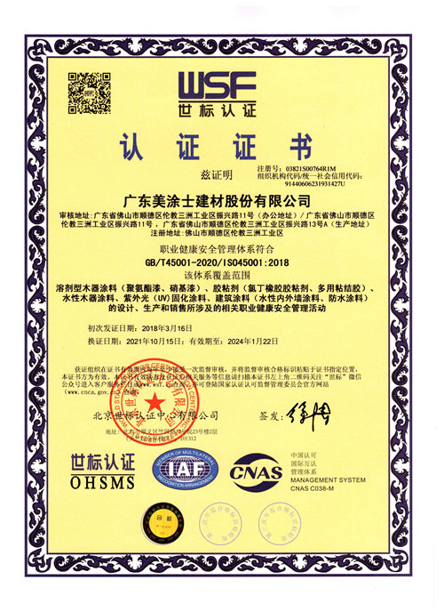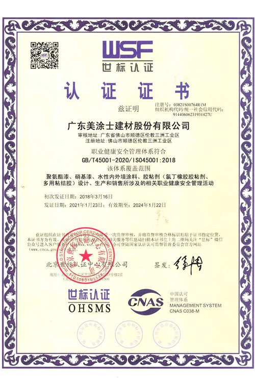 ISO45001职业健康安全管理体系认证证书(2021年)