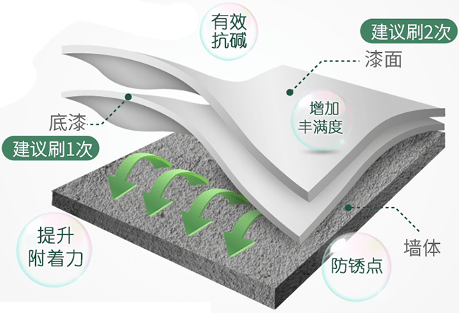 从底到面,底层坚固,面层靓丽防水透气,防霉抗碱,